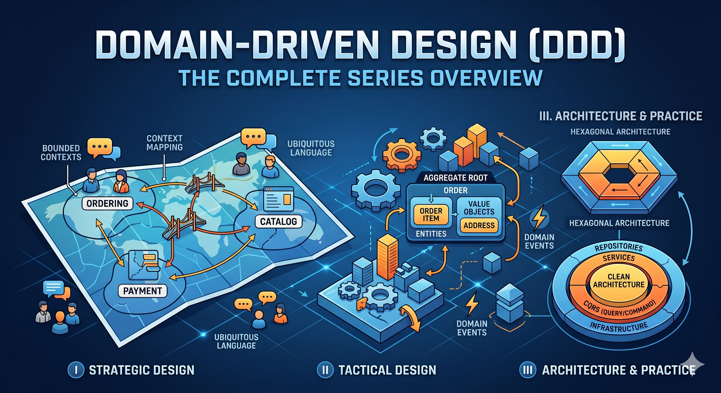 Domain-Driven Design: Building Software That Speaks Business is a 6-chapter series taking you from first principles to production-ready architecture patterns.